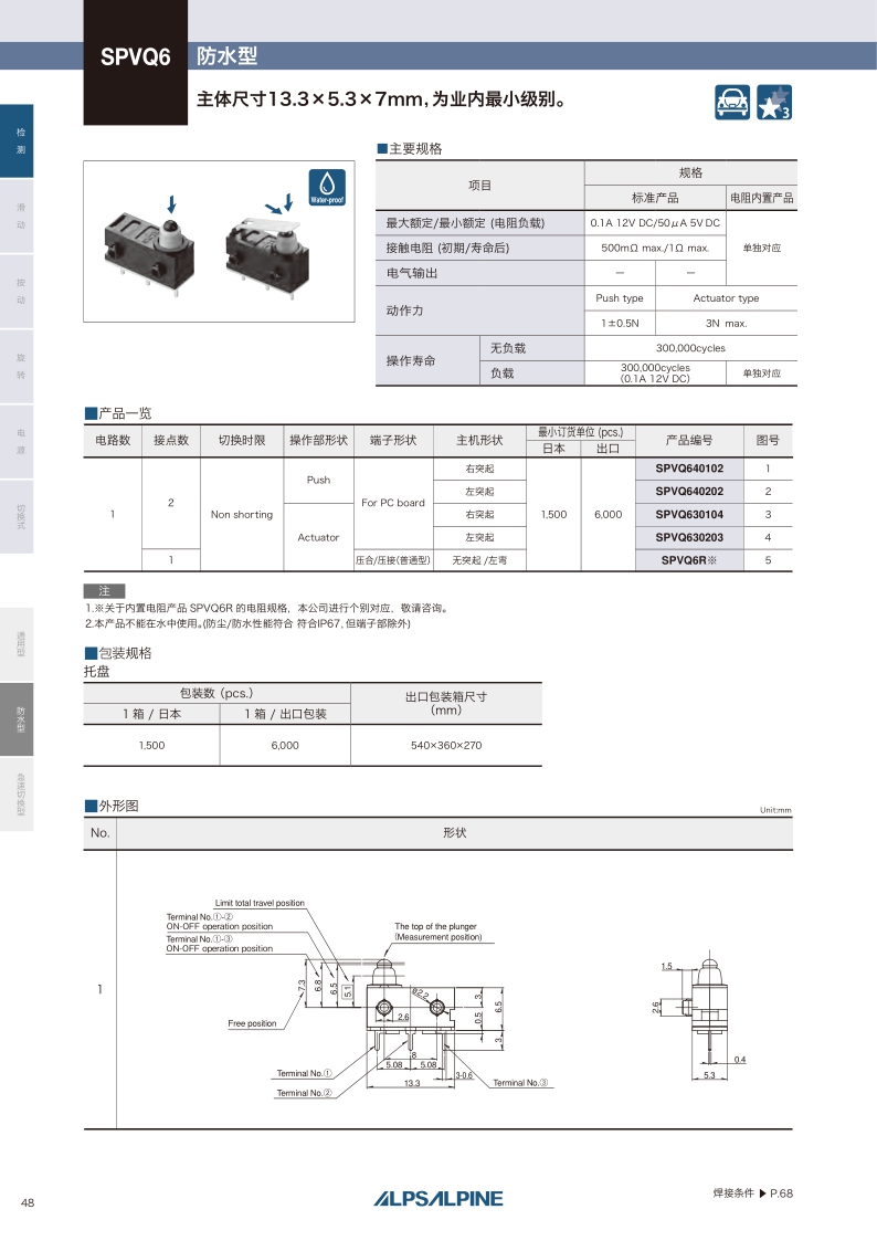 SPVQ630203 照片 1 2 Non shorting Actuator For PC board 3N max. 單側突起(左) 5.3×13.3×6.5mm