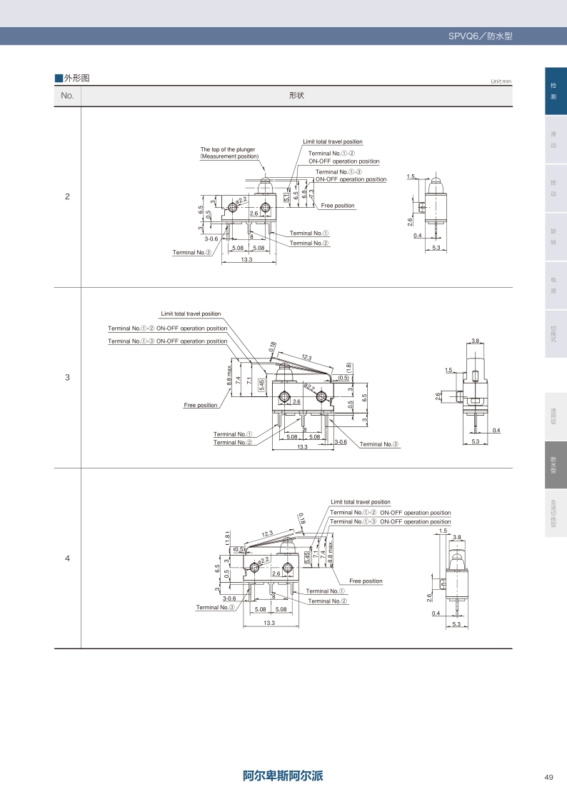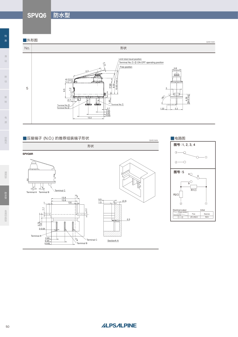SPVQ6R 照片 1 1 Non shorting Actuator 壓合 / 壓接(普通型) 3N max. 無突起 / 左彎 5.3×13.3×6.5mm