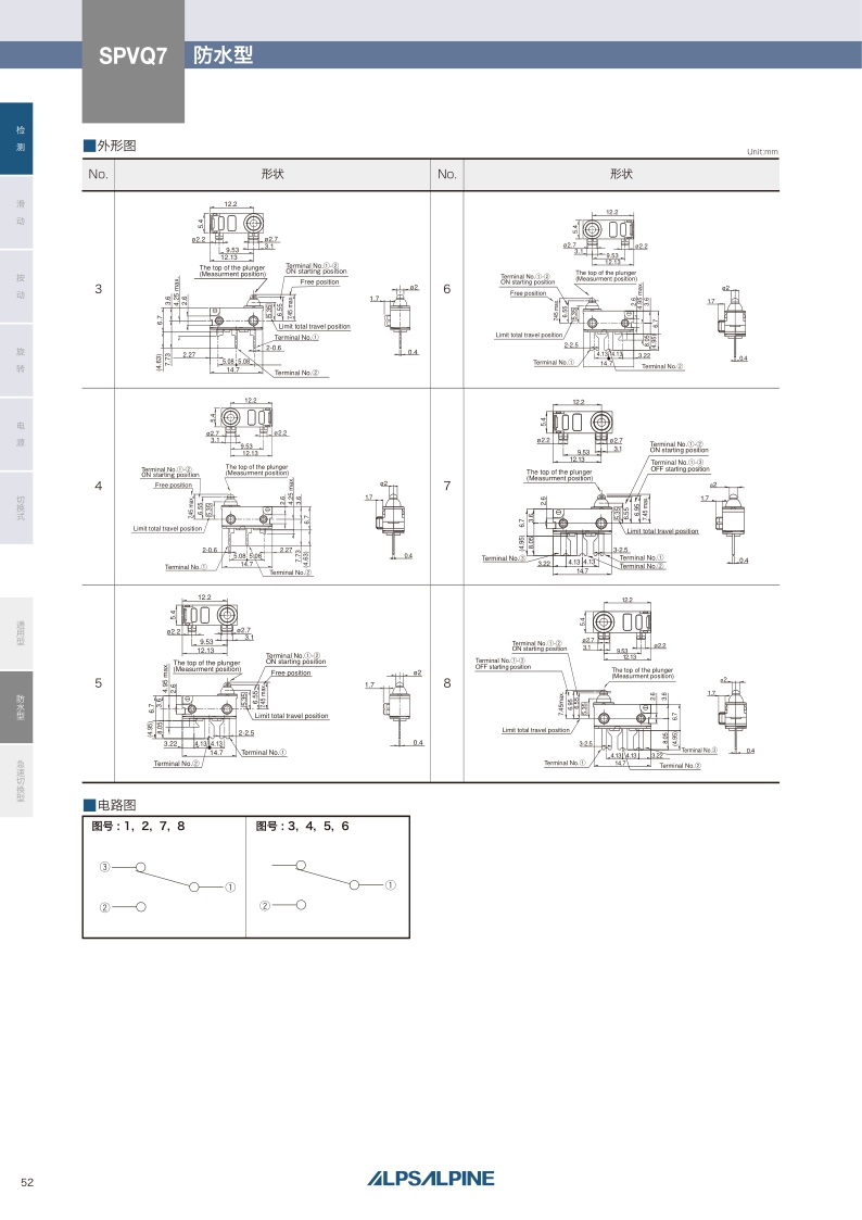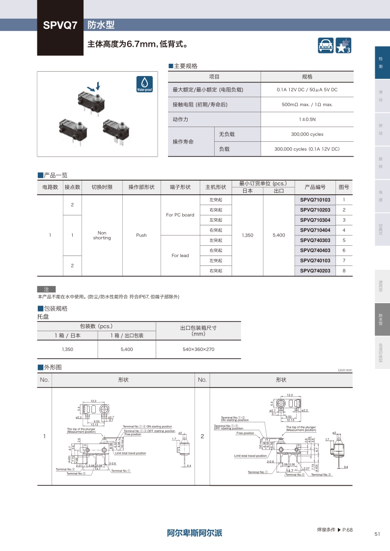 防水型 ? 最大額定值:0.1A 12V DC ? 動作力:1±0.5N ? 操作壽命(無負載):300000 cycles ? 防水及防塵型:IP67。