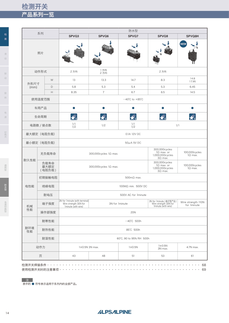 產品編號 照片 電路數 接點數 切換時限 操作部形狀 端子形狀 動作力 主機形狀 尺寸(W×D×H)
