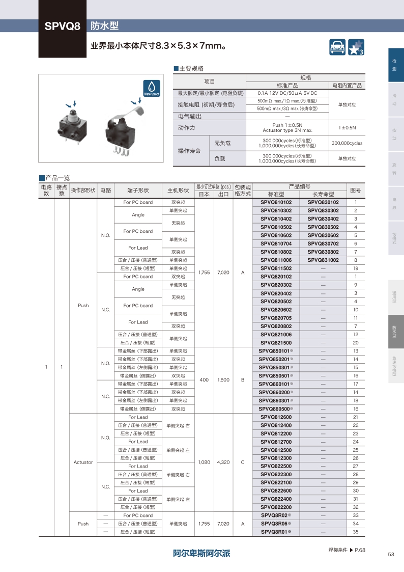 超小型?防水型 / 電阻內置型 ? 最大額定值:0.1A 12V DC ? 動作力:Push: 1±0.5N Actuator: 3N max.? 操作壽命(無負載):Standard: 300000 cycles / Long life: 1000000 cycles ? 防水及防塵型:IP67。