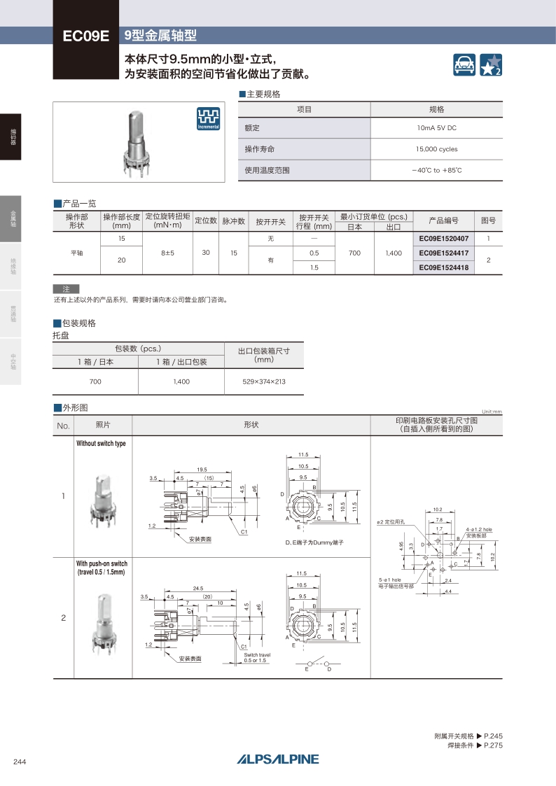 本體尺寸9.5mm的小型·立式,為安裝面積的空間節省化做出了貢獻。輸出:增量(A B 2相輸出) ? 外形尺寸:9mm size ? 定位數:30 ? 脈沖數(位置數):15 ? 操作壽命:15000 cycles ? 最大額定值:10mA 5V DC。
