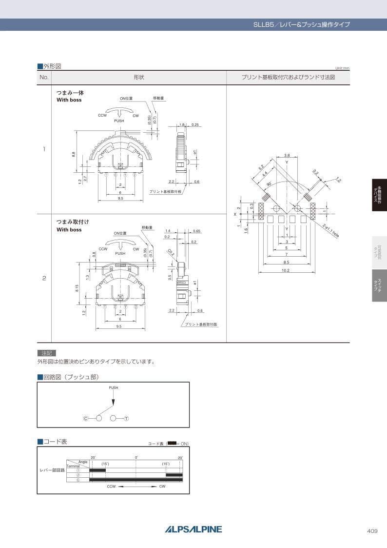 產品編號 照片 操作軸數 軸材質 操作部形狀 按動ON開關 動作力 行程(中心按動) 定位銷 接觸電阻 尺寸(W×D×H)