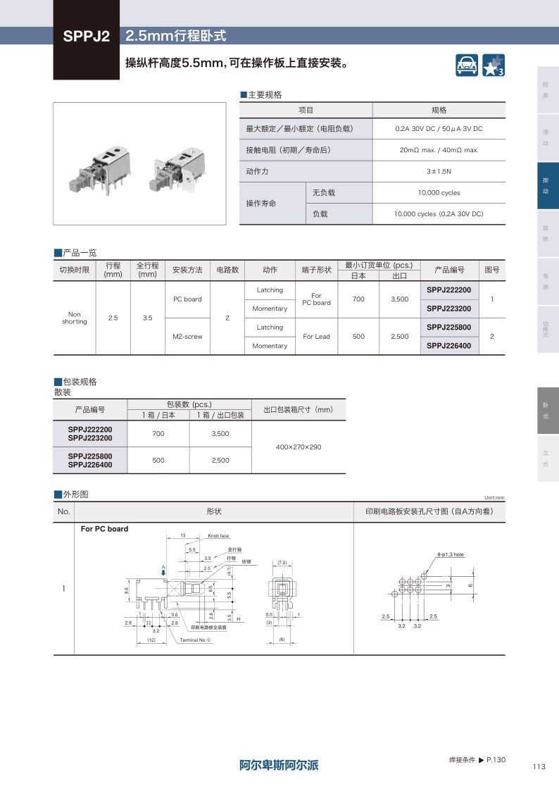 SPPJ223200 照片 Non shorting 2.5mm 3.5mm 3±1.5N PC board 2 Momentary For PC board 12.0×7.2×9.6mm