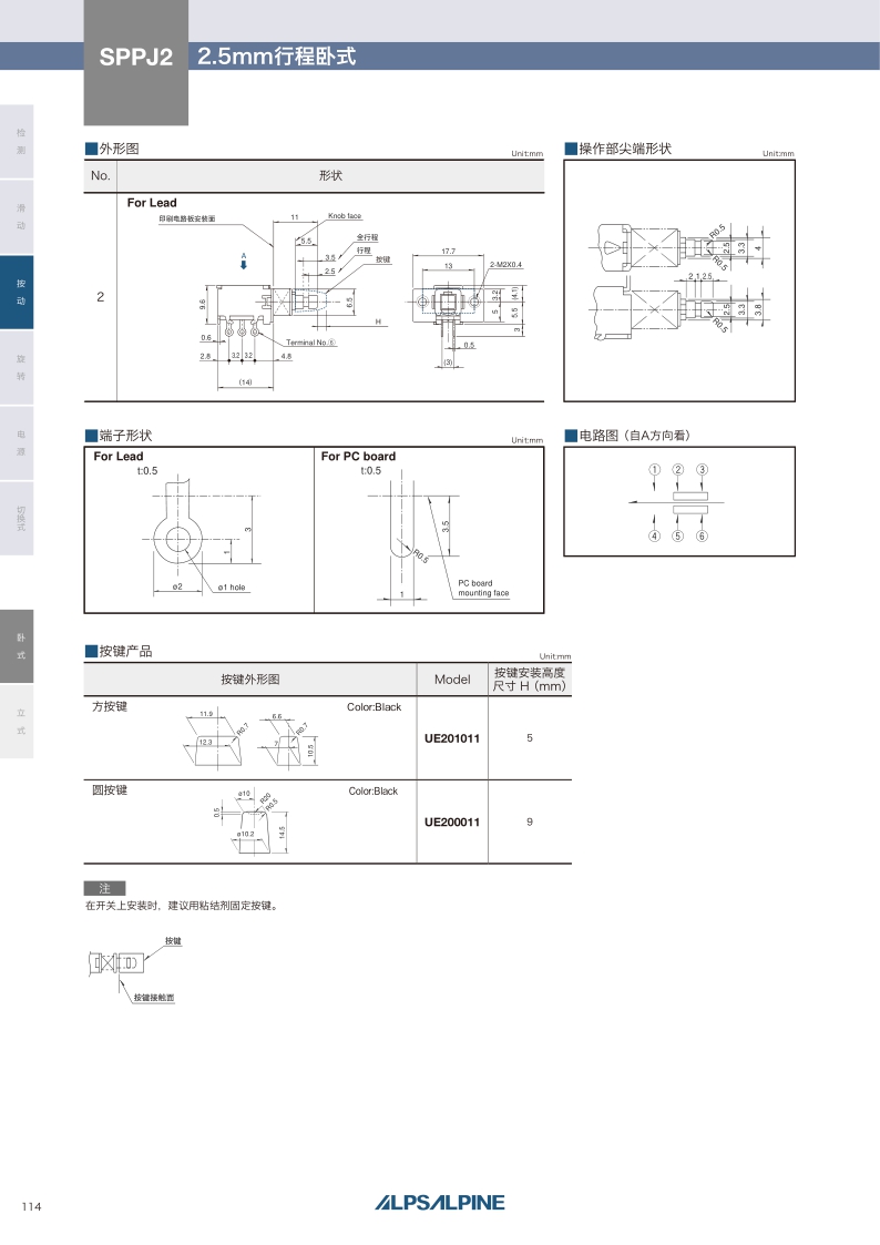 操縱桿高度5.5mm 可在操作板上直接安裝?操作方向:Horizontal ? 最大額定值:0.2A 30V DC ? 行程:2.5mm ? 電路數:2-pole。