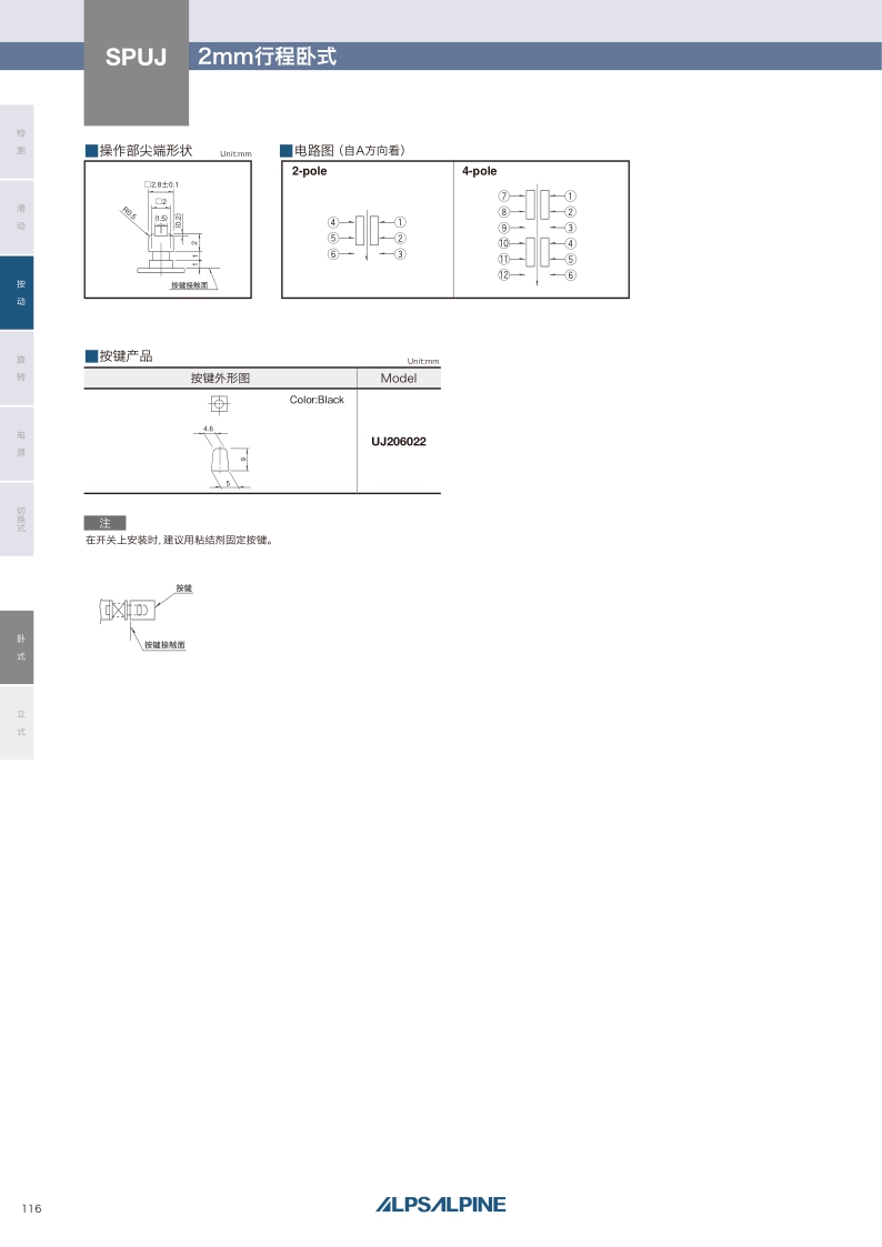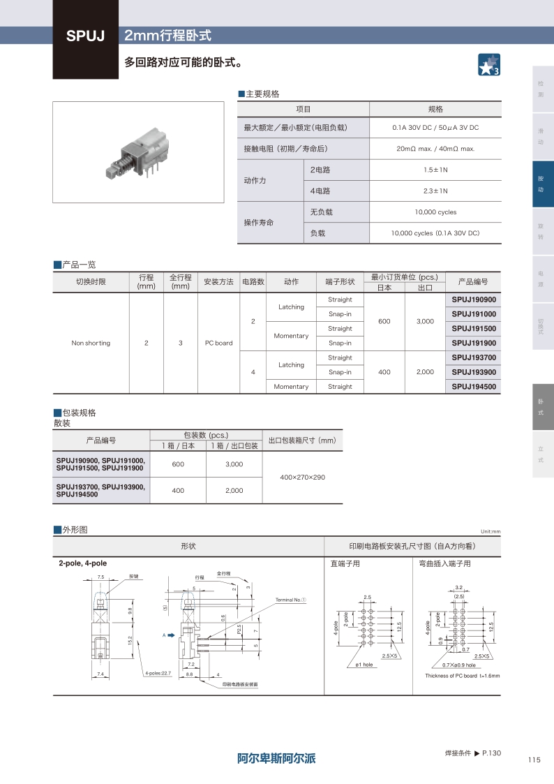 多回路對應可能的臥式,操作方向:Horizontal ? 最大額定值:0.1A 30V DC ? 行程:2.0mm ? 電路數:2/4-pole。
