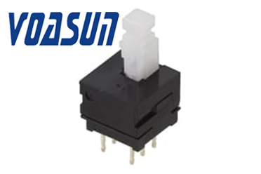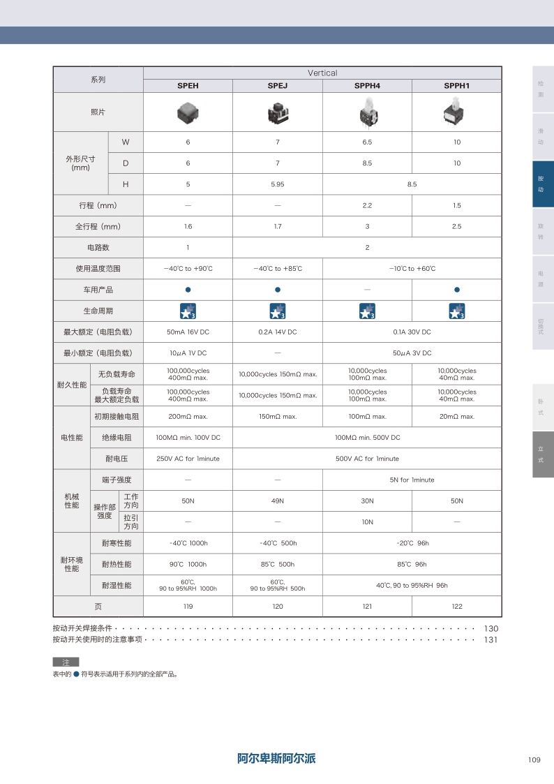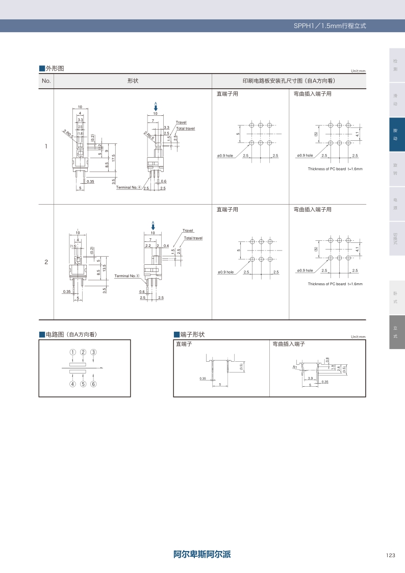具有兩種旋鈕形狀的立式。操作方向:Vertical ? 最大額定值:0.1A 30V DC ? 行程:1.5mm ? 電路數:2-pole。