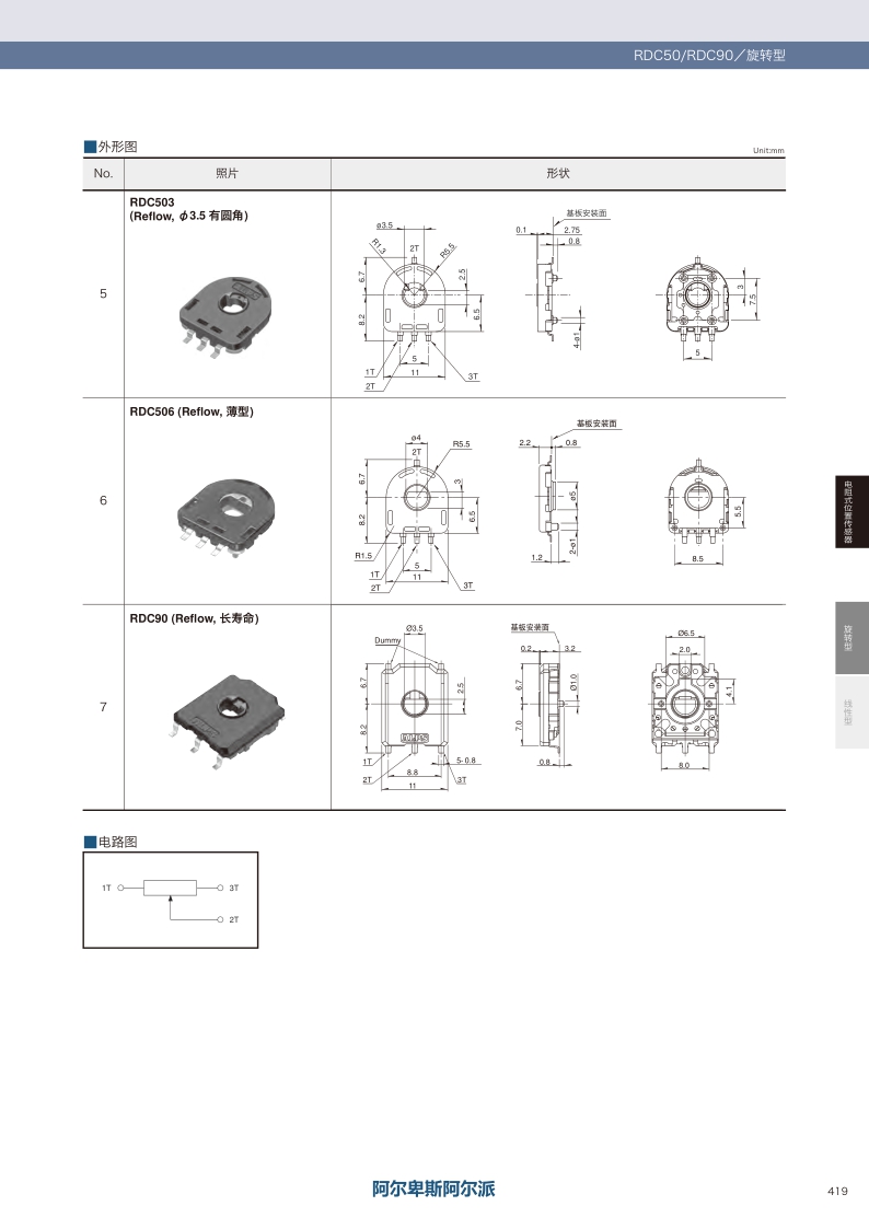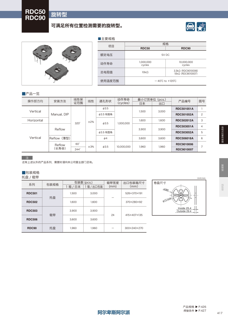 RDC90系列支持超長壽命的位置檢測。型:旋轉型 ? 端子形狀:Reflow ? 線性保證范圍:60° 244° ? 線性:±3% ? 動作壽命:10000000 cycles。