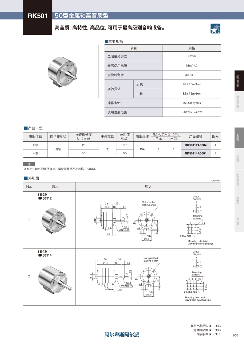 RK501系列高音質 高特性 高品位 可用于高級別音響設備。型:金屬軸高音質 ? 外形尺寸:50型 ? 電阻體數:2聯,4聯 ? 附屬開關:無。