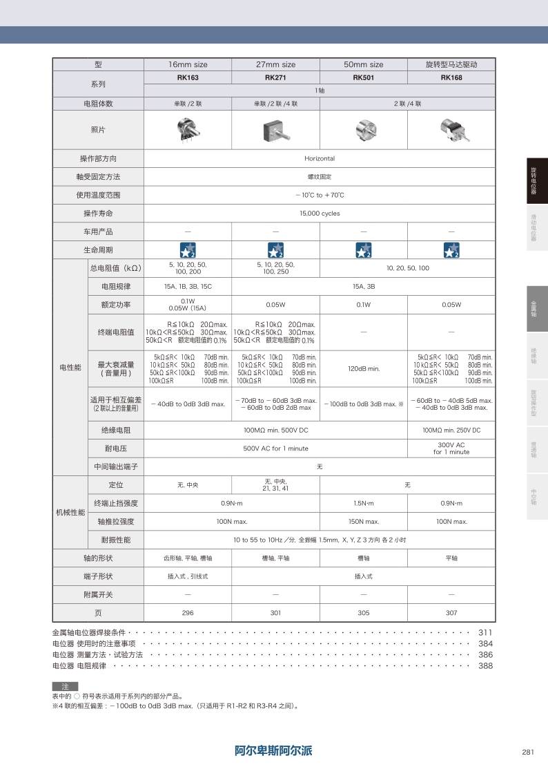 產品編號 照片 操作軸數 電阻體數 操作部方向 軸受固定方法 操作部形狀 操作部長度 定位 總阻值 電阻規律 尺寸