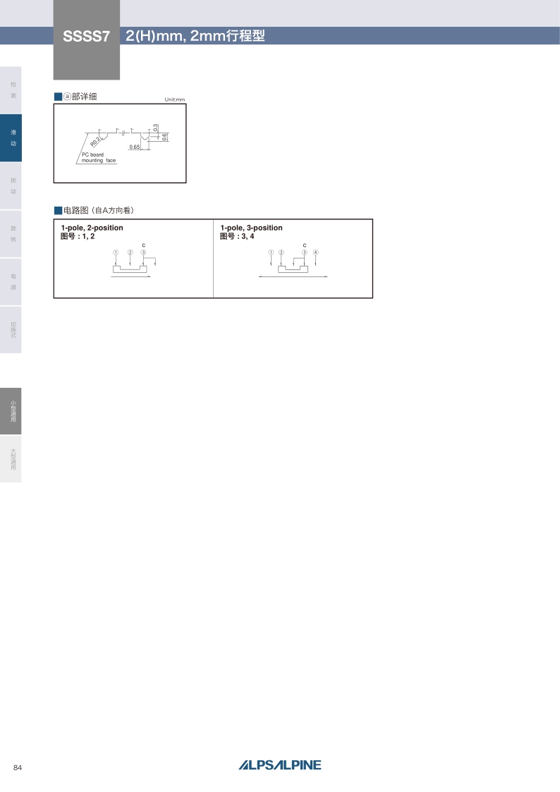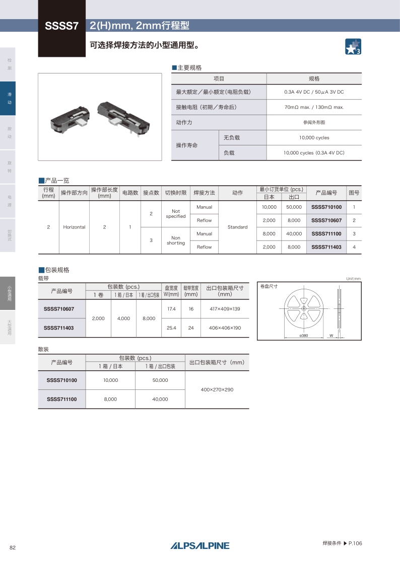 可選擇焊接方法的小型通用型。操作方向:Horizontal ? 安裝高度:2.0mm ? 行程:2.0mm ? 最大額定值:0.3A 4V DC ? 電路數:1-pole。