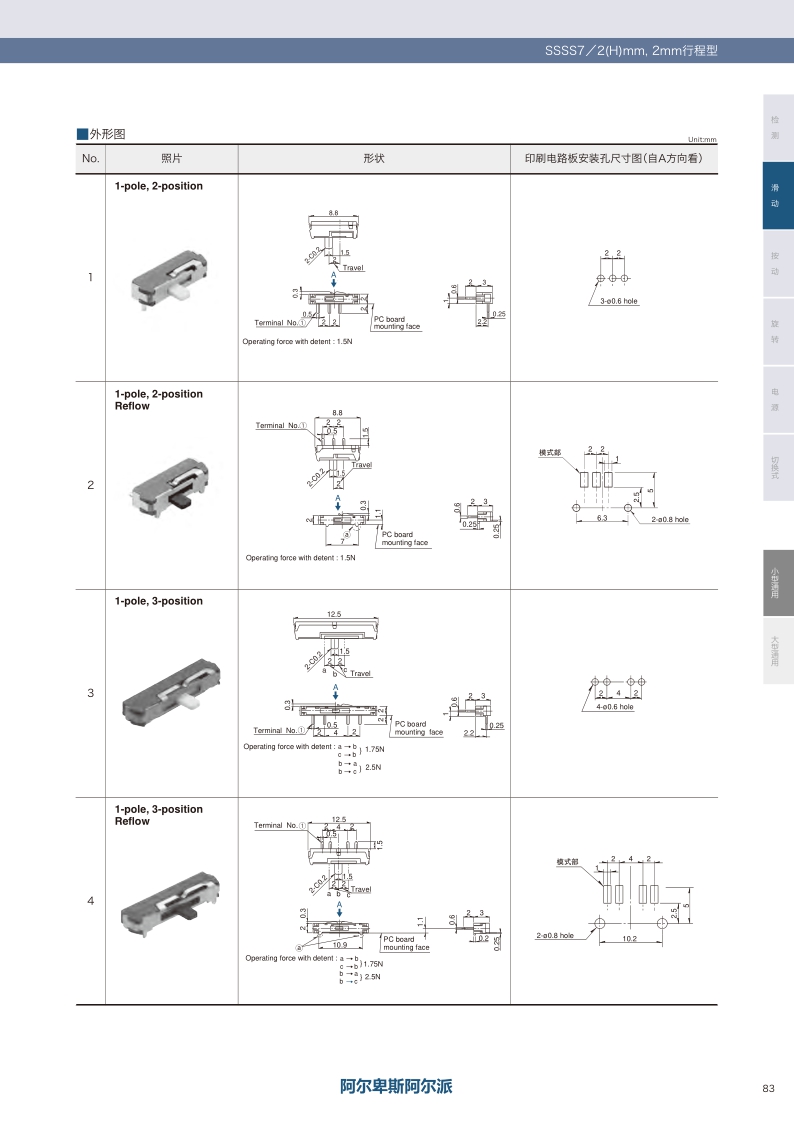 產品編號 照片 行程 操作部方向 操作部長度 電路數 接點數 動作力 切換時限 焊接方法 操作 尺寸(W×D×H)
