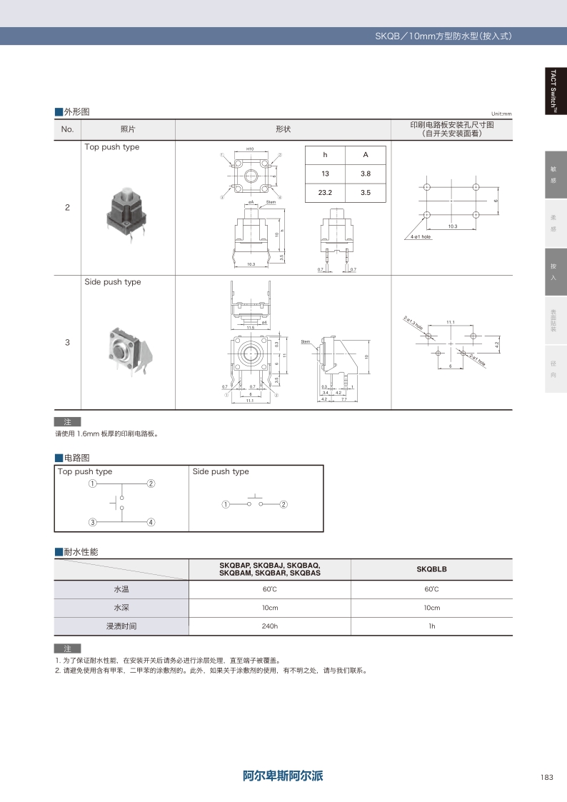 實現良好的防水·防塵結構 適用于有防水要求家電產品。操作感覺:敏感 ? 貼裝方式:按入 ? 尺寸(W×D×H):Top push: □10.0×5.0/13.0/23.2mm Side push: 11.5×11.9×11.3mm ? 特長:防水及防塵型。