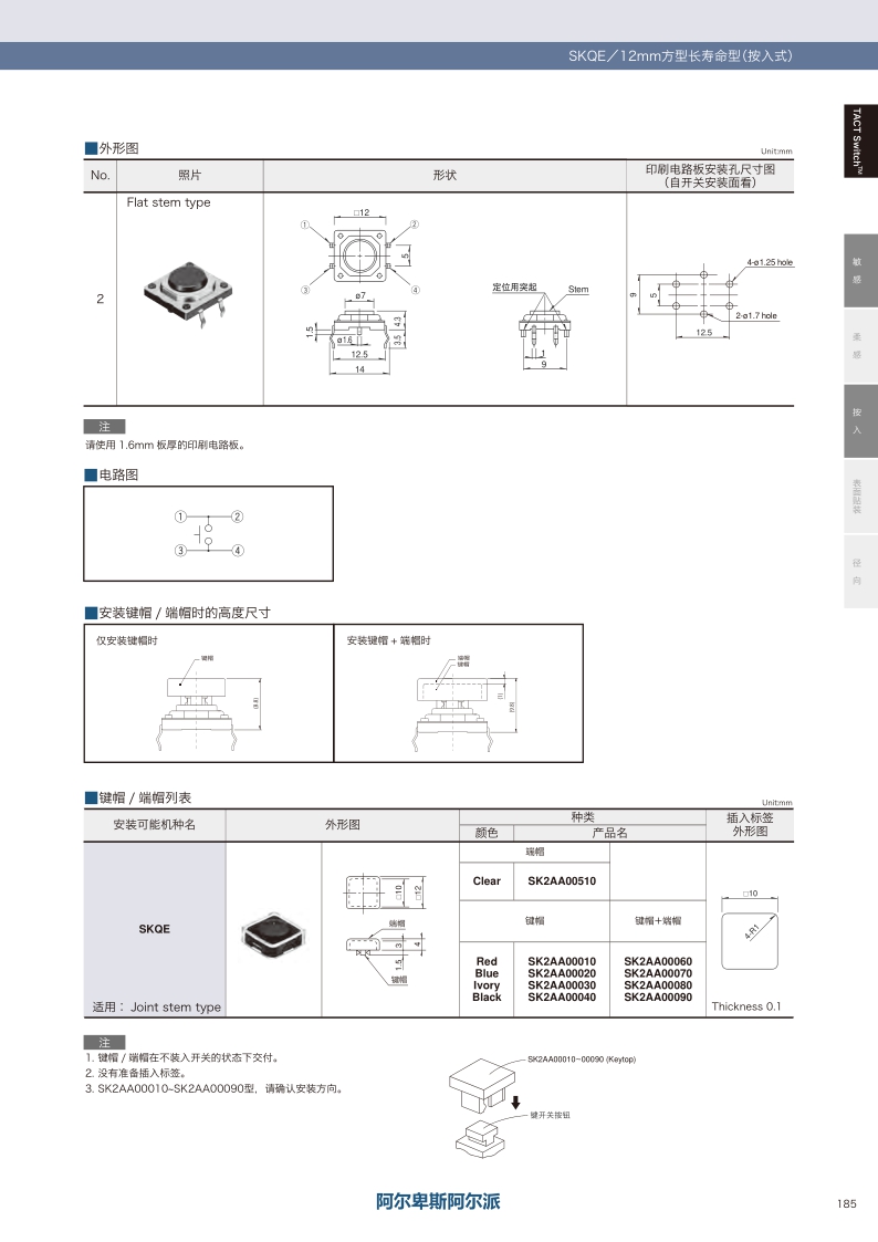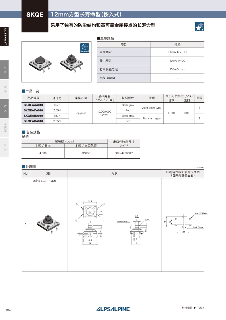 SKQEADA010 照片 按入 2.55N Top push 0.3mm 10,000,000 cycles 100mΩ max. Red Flat stem 12.0×12.0×4.3mm