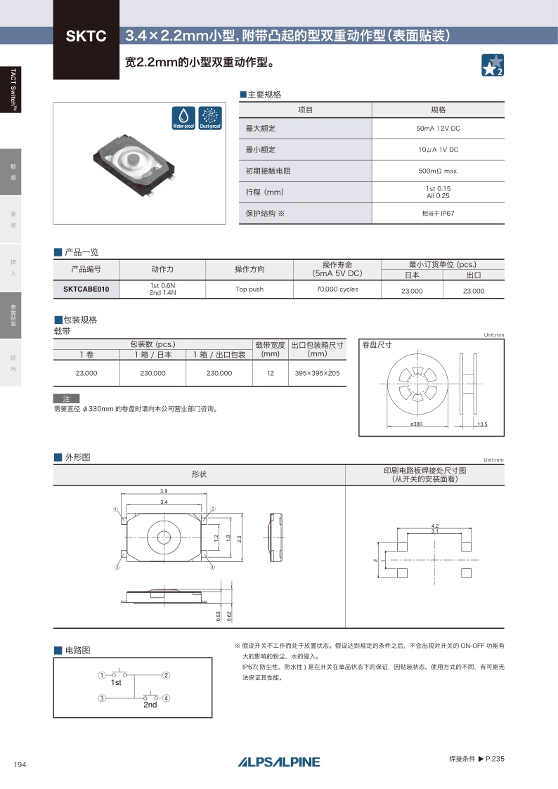 3.4×2.2mm小型,附帶凸起的型雙重動作型(表面貼裝) SKTC系列型號:SKTCABE010