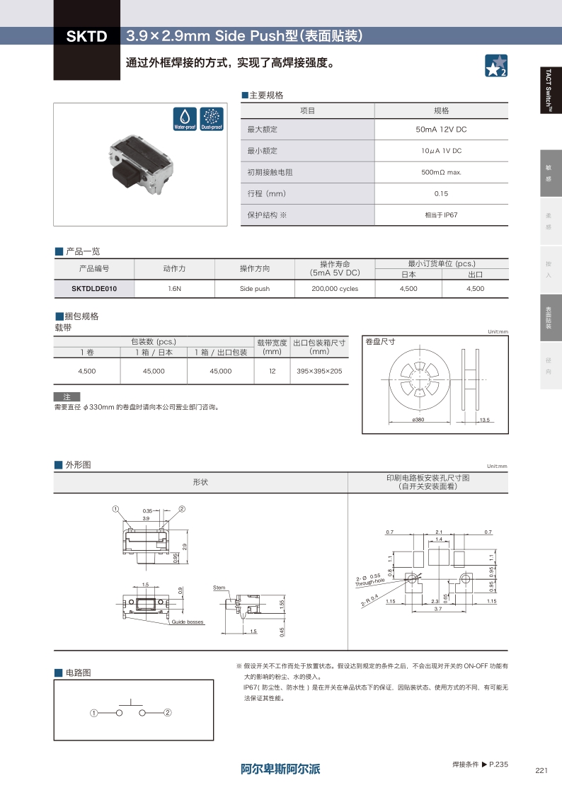 3.9×2.9mm Side Push型(表面貼裝)SKTD系列型號:SKTDLDE010