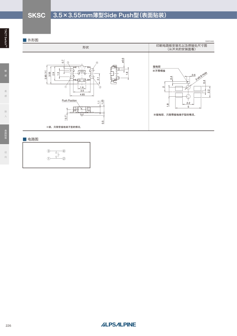 SKSCPBE010 照片 Surface mount 2.2N Side push 0.2mm 1.25mm 100,000 cycles 100mΩ max. 3.5×3.55×1.25