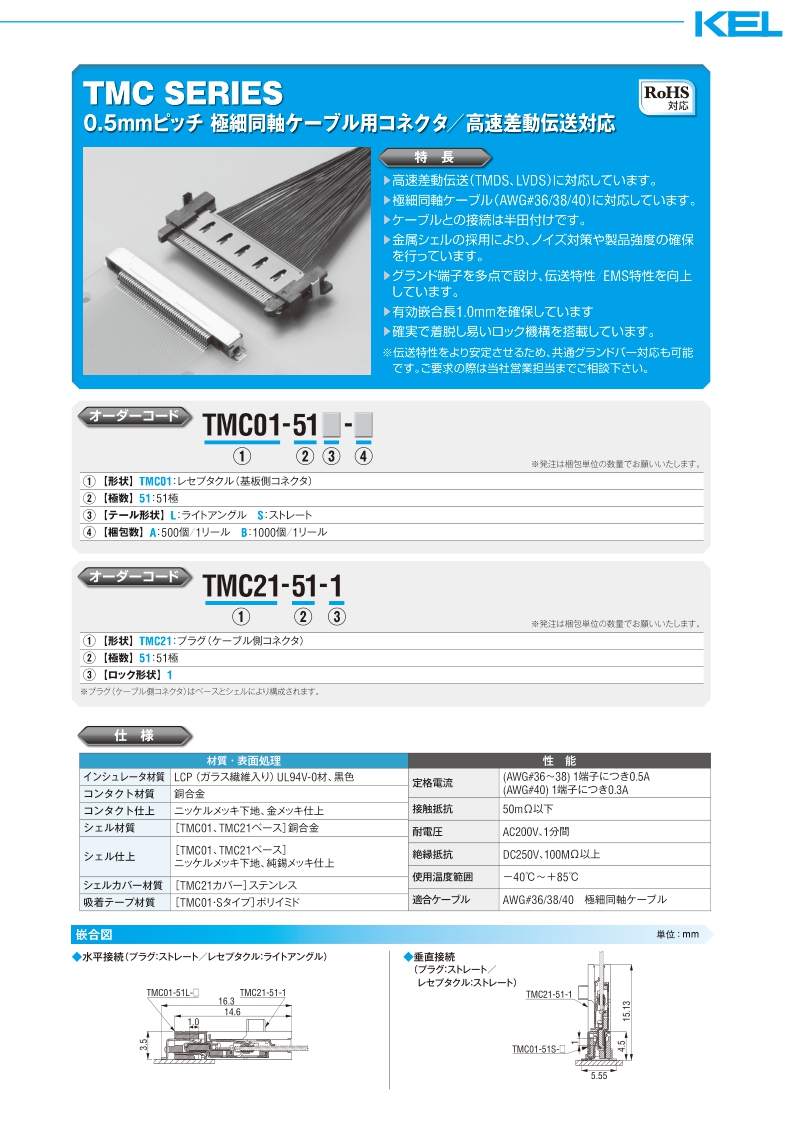 TMC系列是用于超細同軸電纜的0.5mm間距同軸電纜連接器,具有易于裝卸的鎖定結構,可進行高速差分傳輸。連接方式為水平連接和垂直連接。兼容電纜為 AWG#36/38/40。